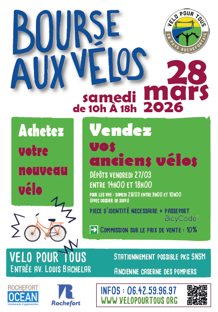 Cette bourse aux vélos est mise en place avec le soutien de la Communauté d’Agglomération Rochefort Océan et la Ville de Rochefort.