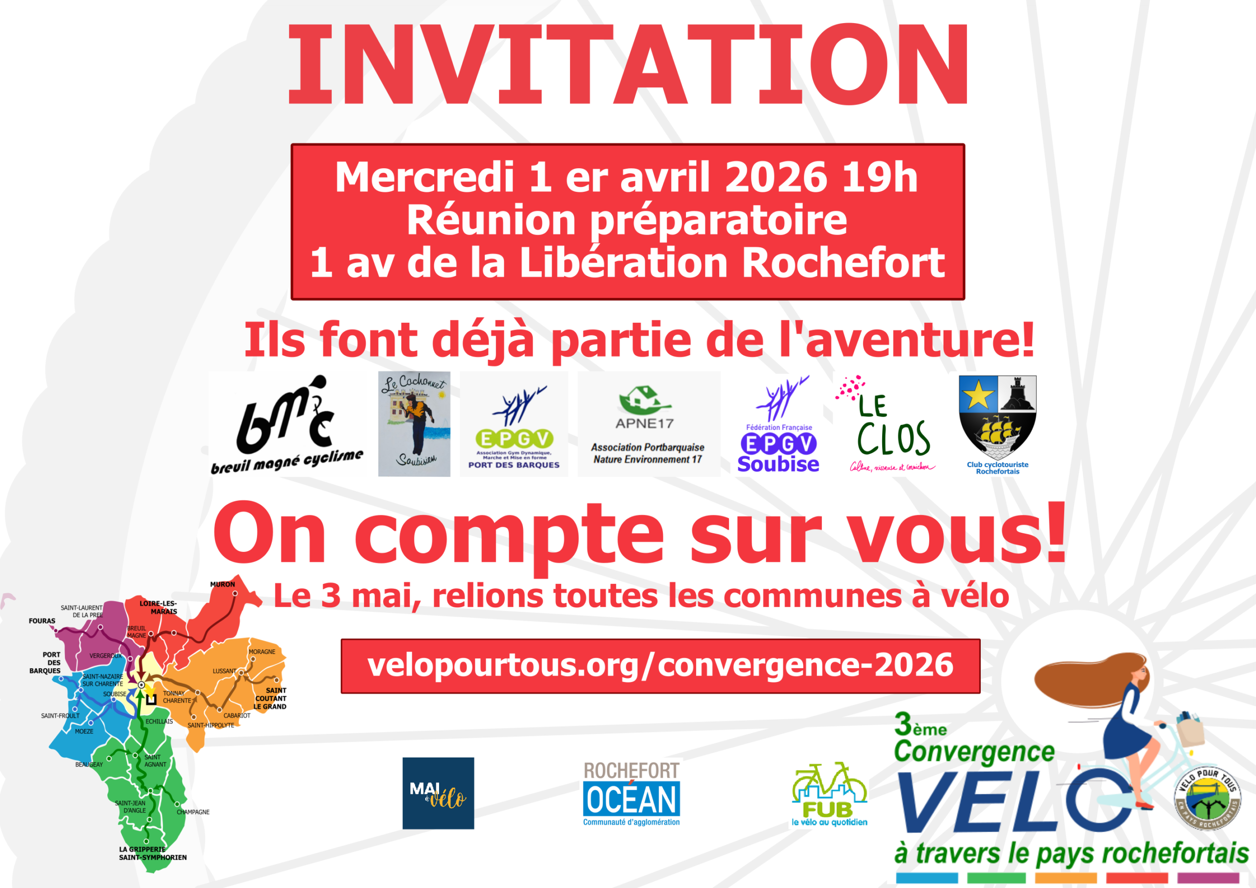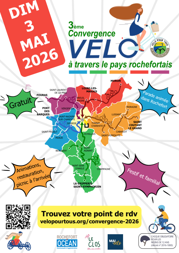 La balade est gratuite et accessible à toutes et à tous. Repérez sur la carte le lieu et l’heure du départ le plus proche de chez vous et rejoignons-nous, aux couleurs de votre circuit, le dimanche 3 mai dans la matinée, seul, en famille avec vos enfants, ou entre amis. Nous convergerons ensemble pour nous retrouver au Cours d’Ablois à Rochefort !