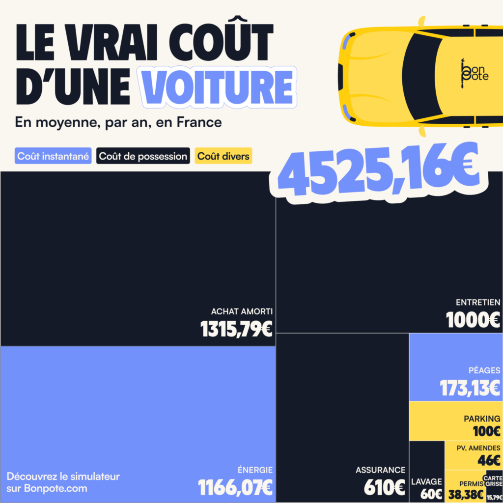 Comptez plus de 4 500 € par an par véhicule, soit 55 centimes par kilomètre (carburant, usure, assurance, stationnement, péages). Et ce, sans compter le temps perdu dans les bouchons ni les nuisances pour la collectivité — pollution, voirie, emprise au sol — que nous payons tous collectivement, conducteurs ou non.