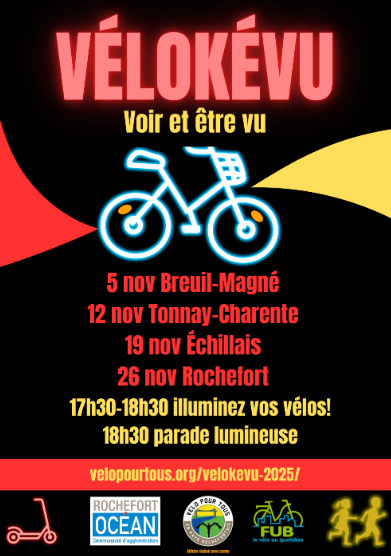 Dans le cadre de la campagne 2025 « Cyclistes Brillez », portée par la Fédération française des Usagers de la Bicyclette (FUB) et la Communauté d’Agglomération Rochefort Océan (CARO), Vélo pour Tous propose, une opération festive et éducative dans les communes de Breuil Magné, Tonnay-Charente, Echillais et Rochefort, ouverte à tous pour petits et grands cyclistes :